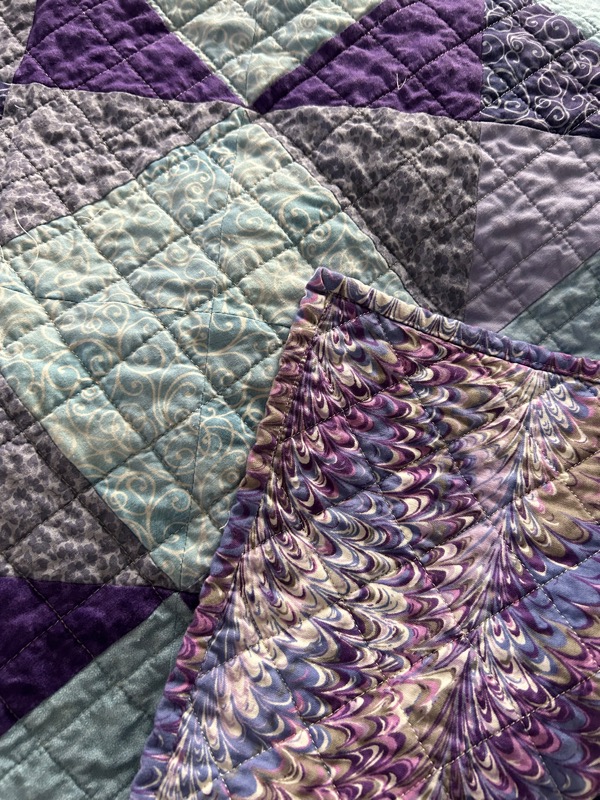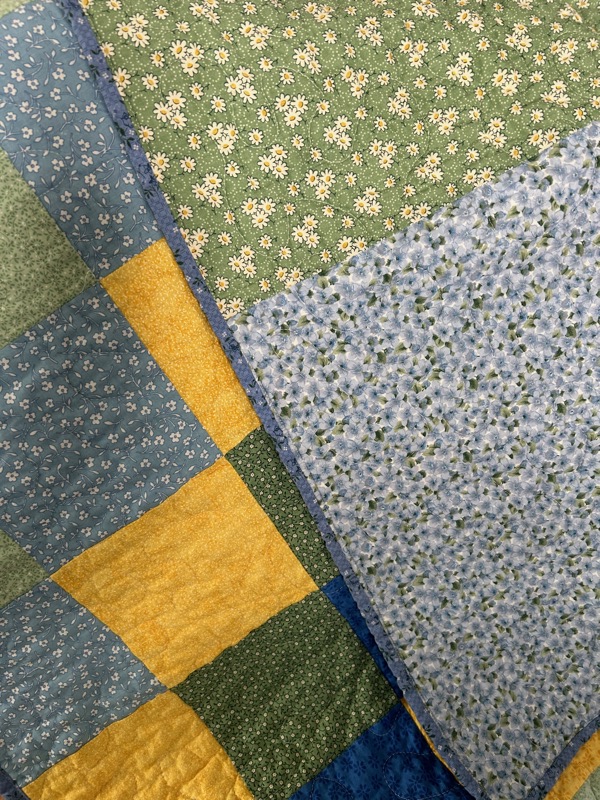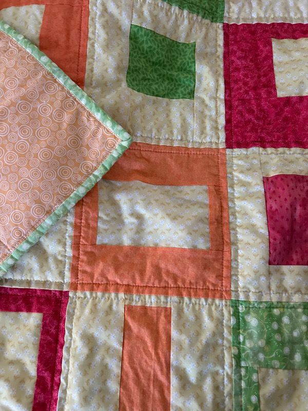 Again, while organizing, I found some old stuff, including stacks of these squares. I had started this quilt many many years ago. Several years ago, I stole some of the squares to make my daughter a bag. Luckily, I think I had originally planned for a queen size quilt, so I still had plenty left over to create this throw-sized quilt. Some of the squares had already been sewn into pairs, so I had to re-figure out how I had planned to put them together and hope I had enough to continue it. I did! The back however, I didn’t have enough of anything coordinating, so I stole a technique from blanket 28, which was to piece together big cuts. Blanket 38 has a binding made from leftovers from this blanket, and this blanket’s binding is leftovers from 38’s backing.