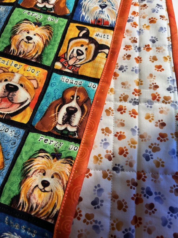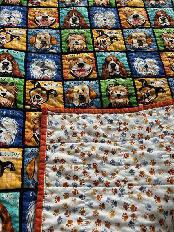 This one didn’t require any piecing. The fabric is a big panel of dog squares! Donated to me by a family member, with this adorable coordinating backing. I had the perfect orange for a binding. This one went together quickly since I didn’t have to piece it, and it’s much smaller.