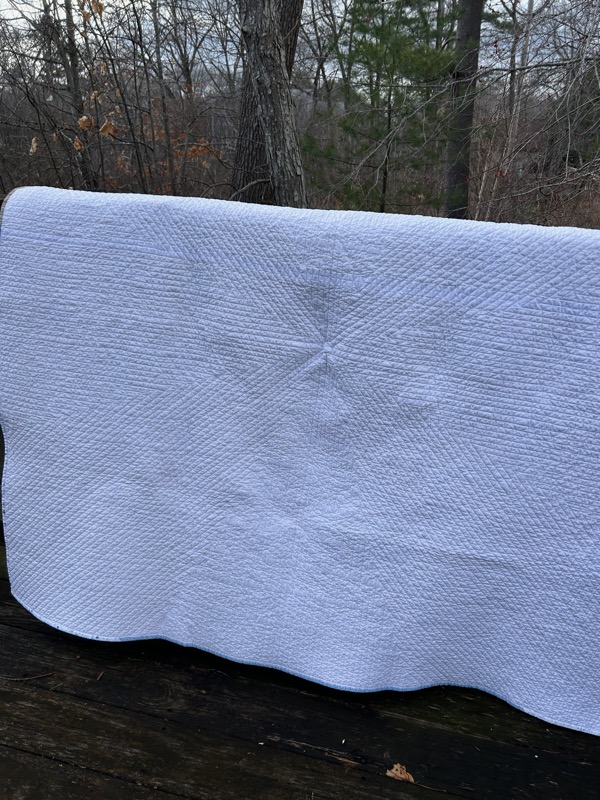 Frighteningly, one of the very first quilt lines I sewed, I got some sort of stain or marking on the top. Possibly sewing machine oil? I should never (and probably will never) make a white quilt again. It was very demotivating to keep seeing that spot every time I came near the center of the quilt. Plus it was on a BLUE fabric, so I couldn’t even spot bleach it out. Anyway, I persevered and thankfully, it came out when I washed the quilt.