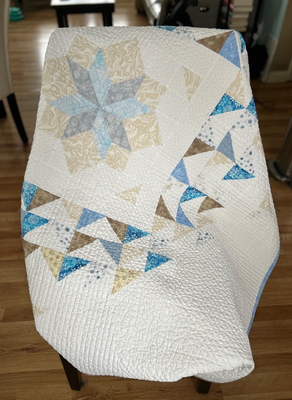 Finally ready to put it all together! It actually wasn’t too bad, or at least easier than I feared it would be. Next up was quilting. As this was a gift, I wanted my best quilting. For me, that means straight line quilting. Normally I would have just done straight across, or up/down. Maybe even diamonds. But the pattern is a giant snowflake, so I wanted to emphasize that. So I made my life harder, by coming down the center, then turning and going up at a diagonal. Also due to the size of the blocks and other considerations, I decided spacing should be every 1/2″. It took a very long time and was very tedious since I couldn’t just mindlessly zip across the quilt for each line.
