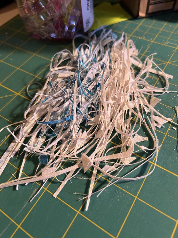 Line up the diagonal of the square with the diagonal tape, make sure the bottom part fills the blue tape, cut off the excess. Flip it around and cut off the other half’s excess. That’s just a portion of my “trim pile” after trimming them all.