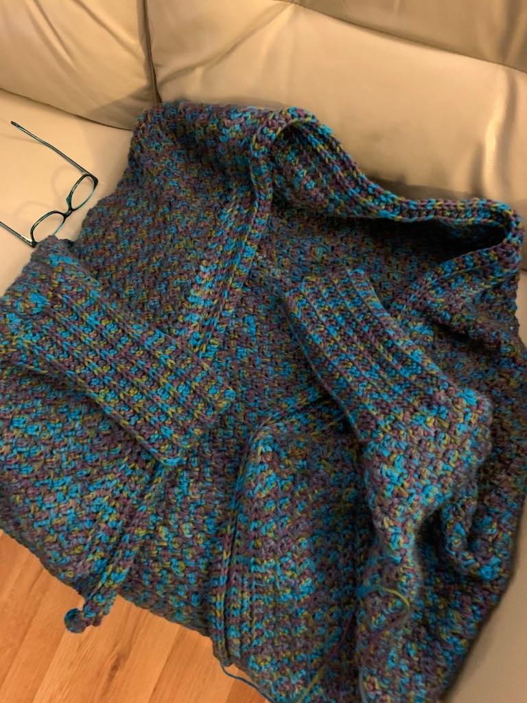 Blanket #4 (again, I’m apparently terrible at capturing the true colors in a photograph, it’s lovely teal, purple, navy, and a bit of green-ish/yellow)