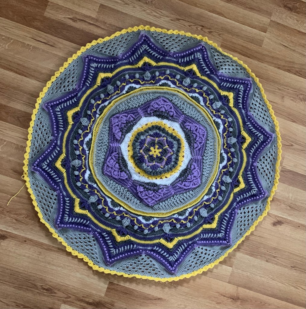 This one is a combo. The same yarn as number 7 and number 5, with the ripple pattern from number 8. It’s smaller than the others because it’s all I had left of the Caron Anniversary Purple Fog (which has been discontinued and that makes me so sad). I used a 11.5mm hook as before with this yarn. Finished size 35″ x 35″.