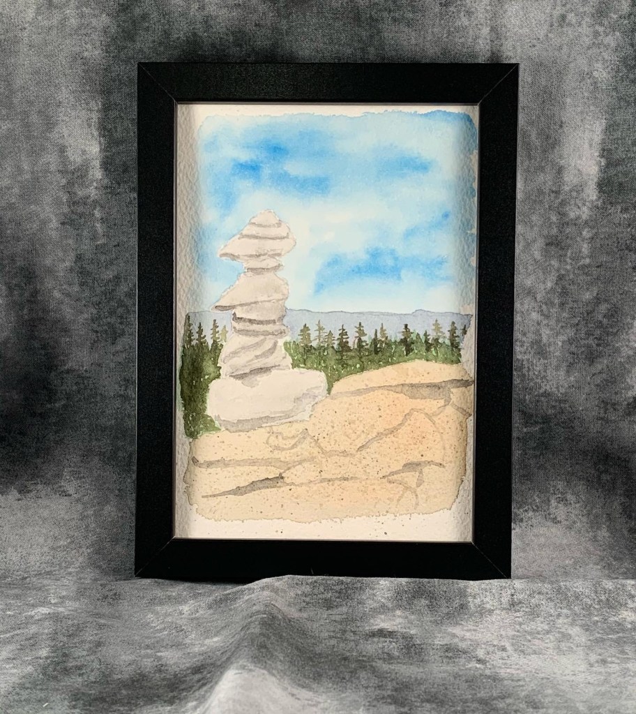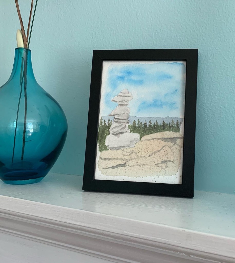 I’m an avid hiker and get a lot of inspiration from the White Mountains. I’m currently working on hiking all 48 of New Hampshire’s 4000 footers. This painting is of the summit cairn on top of Mount Tecumseh, my first 4000 footer! Upon purchase, $5 will be donated to Mount Washington Observatory.