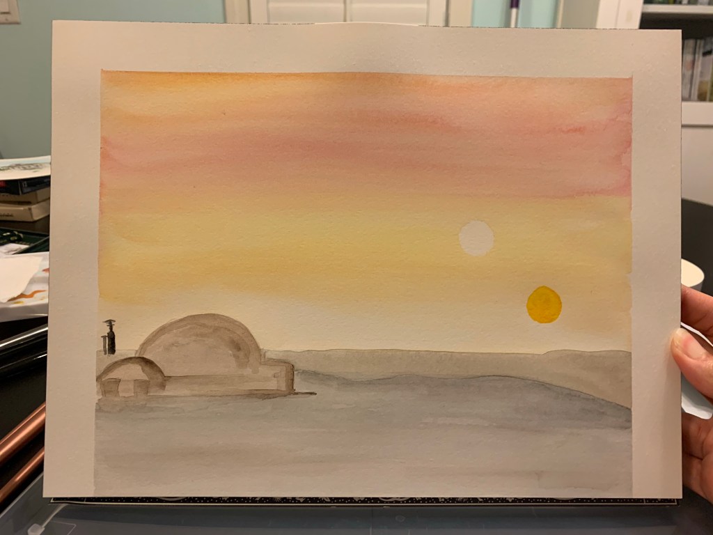Several months ago, I wanted to paint a bookmark-sized painting of Tatooine from Star Wars. I like to paint sunsets, and what’s better than one sun setting, but two!
