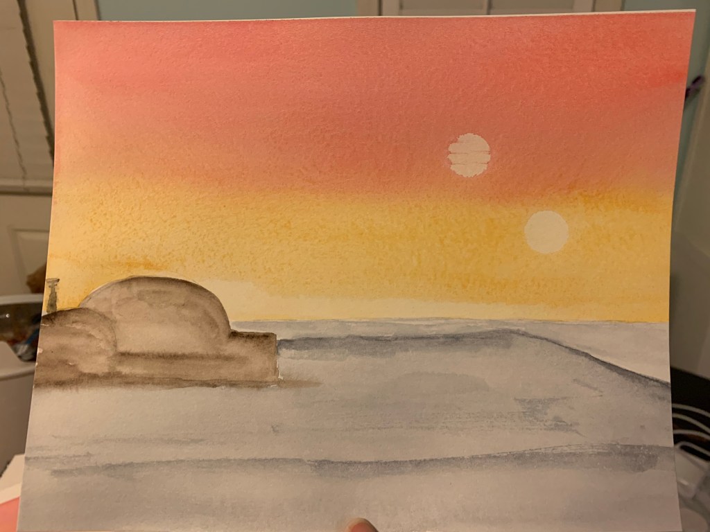 As well as my sun technique changing, you can see the shading of the house changed. I felt the last one was too dark, and liked the way the watercolor splotched in the first two to create shadow and more of the sandy look of Tatooine. The colors changed as I played with the contrast between the house, the sky, the foreground sand, and the distant horizon. Lastly, you can see where I played around with the antenna-like structures in the background.